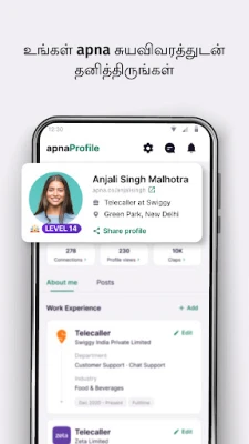 apna, இந்தியாவில் வேலை தேடுபவர்களின் முதன்மைத் தேர்வாக, அவர்களின் தொழில்முறை கனவுகளுக்கு வழி வகுக்கிறது. 5000-க்கும் அதிகமான நம்பகமான வேலைவாய்ப்புகளை வழங்குவதன் மூலம், உங்கள் தேடல் பயணத்தை இது எளிதாக்குகிறது. உங்கள் திறமைகளையும் ஆர்வங்களையும் பிரதிபலிக்கும் ஒரு சுயவிவரத்தை உருவாக்குவதன் மூலம், பணியமர்த்தும் நிறுவனங்களின் கவனத்தை ஈர்த்து, விரும்பிய வேலை வாய்ப்புகளுக்கான வழியைத் திறக்கலாம். தினசரி புதிய வேலைவாய்ப்பு அறிவிப்புகள் மற்றும் முக்கியமான காலியிடங்கள் குறித்த தகவல்களைப் பெறுவதன் மூலம், நீங்கள் எப்போதும் ஒரு படி முன்னேறி இருப்பீர்கள்.