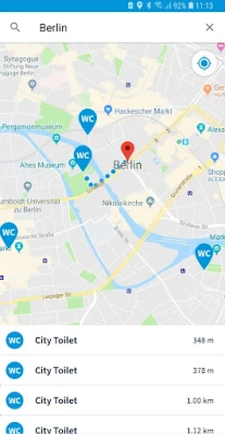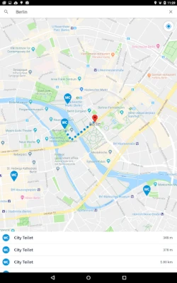 இந்தச் செயலியின் தனித்துவமான வடிவமைப்பு, உங்களது தற்போதைய இருப்பிடத்திற்கு அருகிலுள்ள கழிப்பறைகளைக் கண்டறிவதை மிக எளிதாக்குகிறது. ஒரு குறிப்பிட்ட முகவரியிலோ அல்லது ஆர்வமுள்ள இடத்திலோ நீங்கள் தேட விரும்பினால், அதற்கும் இது வழிவகை செய்கிறது. கண்டறியப்பட்ட அனைத்து கழிப்பறைகளும் ஒரு தெளிவான வரைபடத்தில் புள்ளிவிவரங்களுடன் காட்டப்படும். அதோடு, நீங்கள் விரும்பும் இடத்தைத் தேர்ந்தெடுப்பதை மிகவும் எளிதாக்கும் வகையில், தூரத்தின் அடிப்படையில் துல்லியமாக வரிசைப்படுத்தப்பட்ட பட்டியலாகவும் பார்க்க முடியும். இது பெர்லின் முழுவதும் விரைவான மற்றும் நம்பகமான கழிப்பறைத் தேடலை உறுதி செய்கிறது.