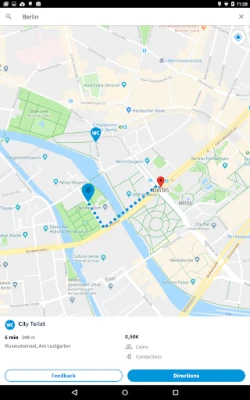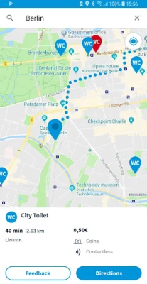 Berlin Toilet ஆப் மூலம் பெர்லினில் பொதுக் கழிப்பறைகளைக் கண்டுபிடிப்பது எளிது. 200க்கும் மேற்பட்ட கழிப்பறைகள், அணுகல் தகவல்கள், வரைபடத்தில் இருப்பிடம், வழித்தடம் மற்றும் டிஜிட்டல் பணம் செலுத்தும் வசதி ஆகியவற்றை இதில் காணலாம்.