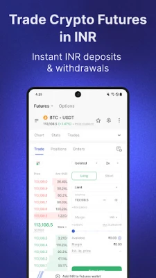 CoinDCX Bitcoin & crypto trading app ஒரு ஒருங்கிணைந்த கிரிப்டோ தளமாக செயல்படுகிறது, ஆரம்பநிலை முதலீட்டாளர்கள் முதல் அனுபவமிக்க வர்த்தகர்கள் வரை அனைவருக்கும் ஏற்ற அம்சங்களைக் கொண்டுள்ளது. உங்கள் விருப்பத்திற்கேற்ப வெளிச்சம் (light) மற்றும் இருண்ட (dark) முறைகளில், தனிப்பயனாக்கக்கூடிய தீம்களுடன் உங்கள் அனுபவத்தை மேம்படுத்துங்கள். பிட்காயின், எத்தீரியம் மற்றும் முதல் 10 கிரிப்டோக்களில் 100x வரையிலான லெவரேஜுடனும், 300-க்கும் மேற்பட்ட கிரிப்டோ ஃபியூச்சர்ஸ் ஜோடிகளில் 50x வரையிலான லெவரேஜுடனும் வர்த்தகத்தில் ஈடுபடுங்கள். 1000-க்கும் மேற்பட்ட கிரிப்டோக்களுடன் ஸ்பாட் வர்த்தகம் செய்ய குறைந்த கட்டணத்தில் அணுகல், பிரத்யேக கிரிப்டோ ஃபியூச்சர்ஸ் வாலட் மற்றும் மேம்படுத்தப்பட்ட லாபத்திற்கான கிராஸ் மார்ஜின் போன்ற பல அம்சங்கள் உள்ளன. குறைந்த விலைச் சறுக்கல் மற்றும் விரைவான வர்த்தக ஆர்டர் செயலாக்கத்துடன் ஆழ்ந்த லிக்விடிட்டியை அனுபவியுங்கள். Web3 Mode மூலம் 50,000-க்கும் மேற்பட்ட டோக்கன்கள் மற்றும் முன்-வெளியீட்டு டோக்கன்களுக்கான நேரடி அணுகலைப் பெறுங்கள்.