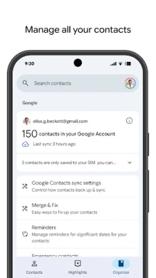 Contacts உங்கள் தொடர்புகளை Google கணக்கில் பாதுகாப்பாகக் காப்புப் பிரதி எடுத்து, அனைத்துச் சாதனங்களிலும் ஒத்திசைக்கிறது. நீக்கியவற்றை மீட்டெடுத்து, நகல் தொடர்புகளை ஒன்றிணைத்து, பிறந்தநாள் போன்ற முக்கிய நிகழ்வுகளைப் பார்க்கவும் உதவும். உங்கள் தொடர்புகளை எளிதாக ஒழுங்கமைத்து, எப்போதும் சமீபத்திய நிலையில் வைத்திருக்கலாம்.